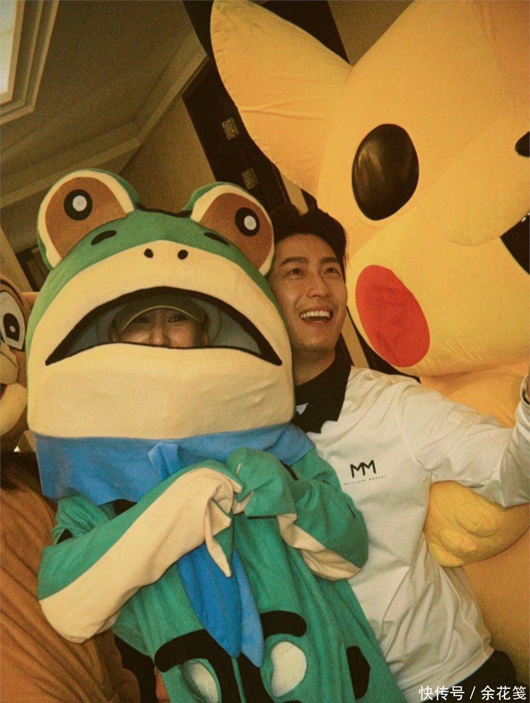 比起窦骁和一又友们的合照,天下更暖和他与何超莲的互动。像片里,窦骁搂着穿青蛙玩偶服的何超莲,脸紧贴玩偶脸,何超莲在玩偶服里双手放胸前,身子当然朝窦骁歪斜,两东谈主眼中尽是笑意。