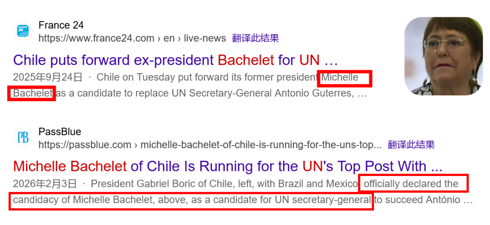 ▲上图:2026年2月3日的音问走漏,智利社交官米歇尔·巴切莱特将竞选连合国书记长。现任书记长安东尼奥·古特雷斯(António Guterres)的第二届任期将合手续至2026年底。图源:网罗